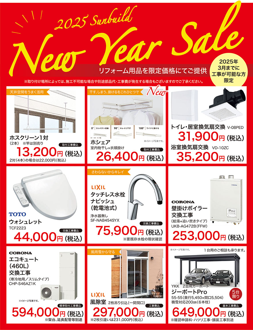 サンビルドでは、リフォーム用品を大特価にて販売中! 「2025 New Year Sale」開催中です!! ※2025年3月までに工事が可能な方限定 ※取り付け場所によっては、施工不可能な場合や別途部品代・工事費が発生する場合もございますのでご了承ください。 商品購入ご希望のお客様はサンビルドまでお問い合わせください! TEL0172-33-0611