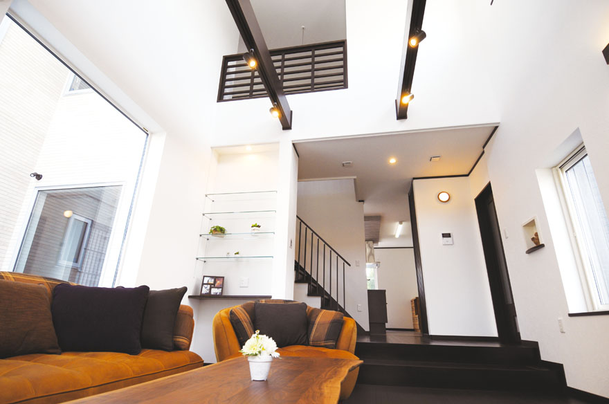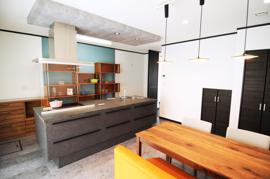 お施主様とサンビルドが一緒に造りあげた重厚感のある住まい 吹き抜けのあるリビングとアイランドキッチンは、開放感があり広々とした空間で、家事をしながらでも家族とコミュニケーションをとることができます。 またキッチンのワークトップには、熱による変形や傷に強いセラミックトップを使用し、長く快適に調理を行えます。